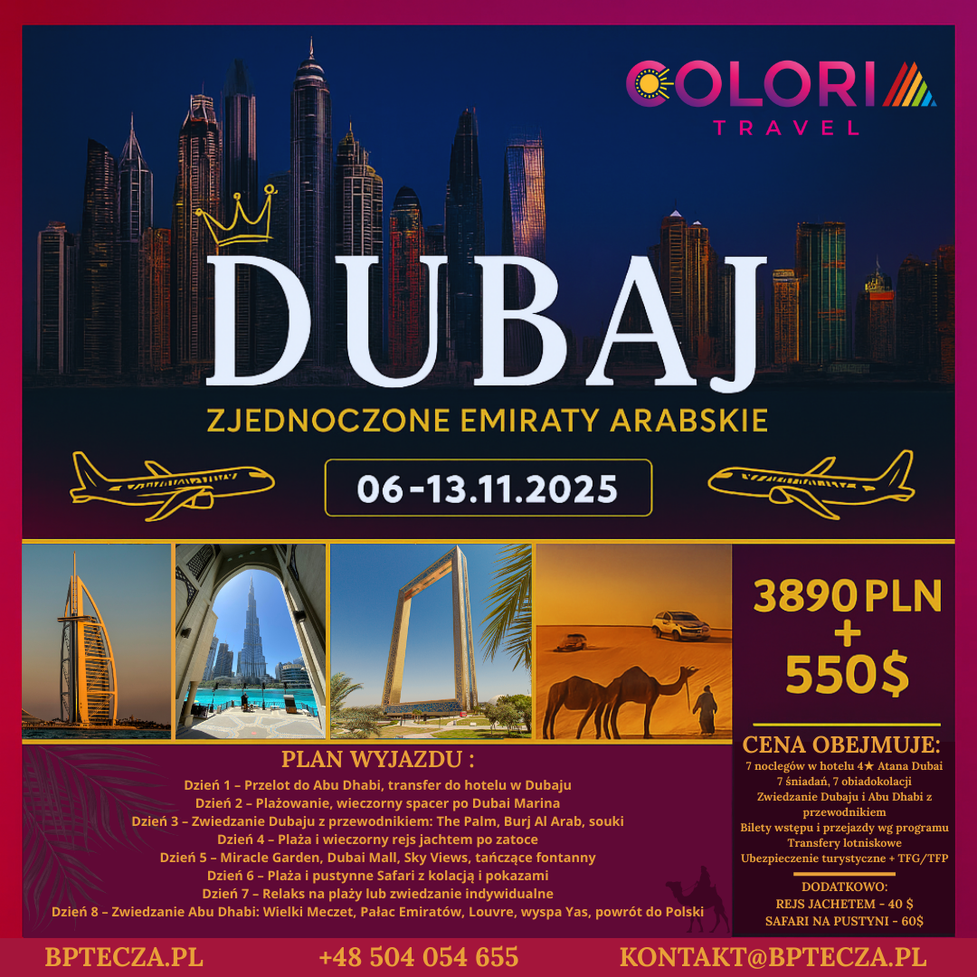 Zapraszamy na niezapomnianą podróż do jednego z najbardziej ekscytujących miejsc na świecie – Dubaju i Abu Dhabi. To wycieczka, która łączy egzotykę, nowoczesność, luksus i orient w jednym wyjątkowym pakiecie.
